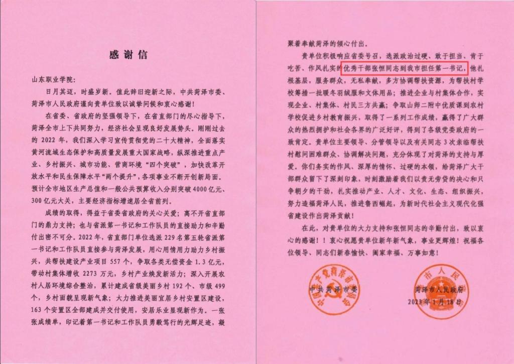 感謝信中表示,學校選派的張恒同志自駐村以來,扎根基層、服務群眾、無私奉獻,多方協調幫扶資源,幫扶村學校籌措物品、爭取優質課促進鄉村教育振興,推進企業與村集體合作,取得一系列的成績,受到廣泛好評。學校領導多次親臨幫扶村慰問困難群眾、協調解決問題,充分體現了對菏澤的支持與厚愛。