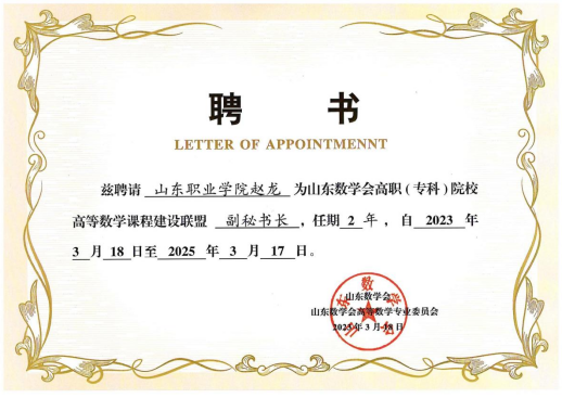 山東省數學會高職(專科)院校高等數學課程建設聯盟成立于2015年,主要職能是開展學術交流、進行課程資源建設、組織師資培訓和學生競賽等,全省已有71所高職院校加入。趙龍同志當選第四屆高職數學課程建設聯盟副秘書長,充分彰顯山東數學會及同類院校對我校高等數學課程教育教學工作的高度認可。