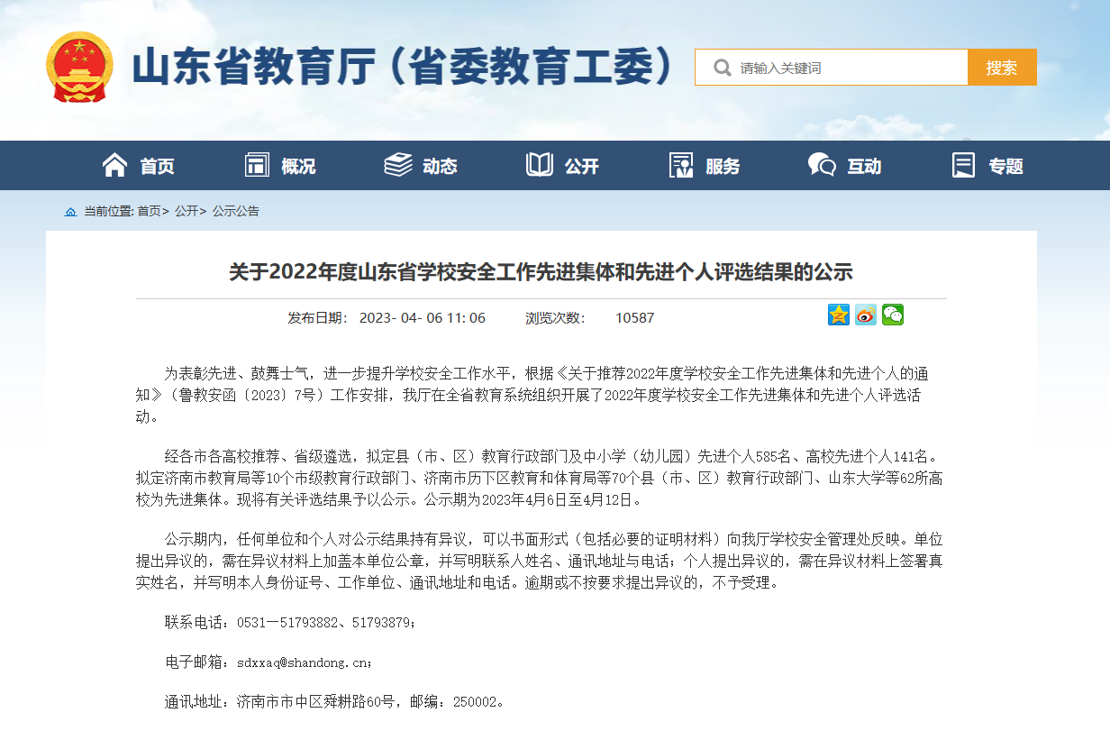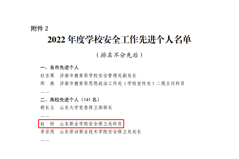 近日,山東省教育廳發布《關于2022年度學校安全工作先進集體和先進個人的通報》,我校獲評2022年度學校安全工作先進集體,學校安全保衛處趙恒被評為2022年度學校安全工作先進個人。