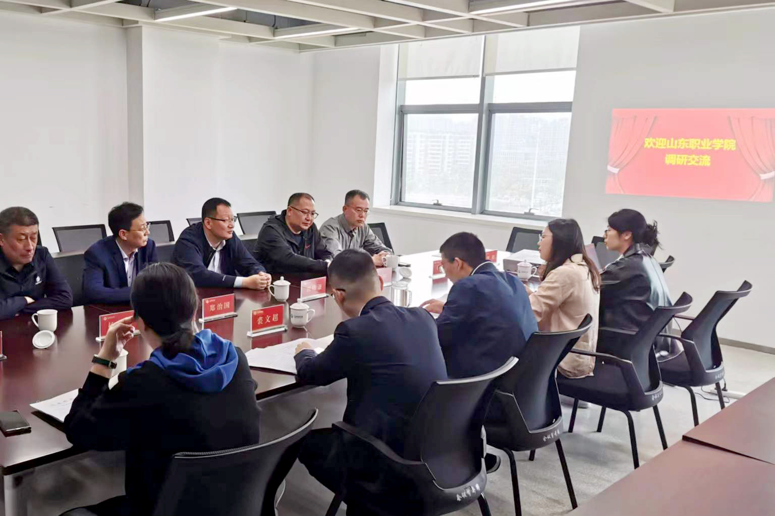 在寧波軌道交通集團有限公司,調研團與運營中心副總經理孫晉敏、人資部長裘文超、訂單班專員徐靜靜、學校畢業生代表進行座談。雙方就產教融合、崗位拓展、訂單培養、校園招聘、畢業生成長、職業穩定性等內容深入交換了意見,形成了一系列校企深度融合、互惠共贏的共識。