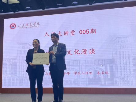 4月27日下午,我校第五期人文大講堂在多功能音樂廳開講。山東師范大學副教授王紅娟應邀做專題講座。人文與基礎課教學部主任趙龍為王紅娟頒發客座教授聘書。講座由人文與基礎課教學部黨總支副書記周杰主持。