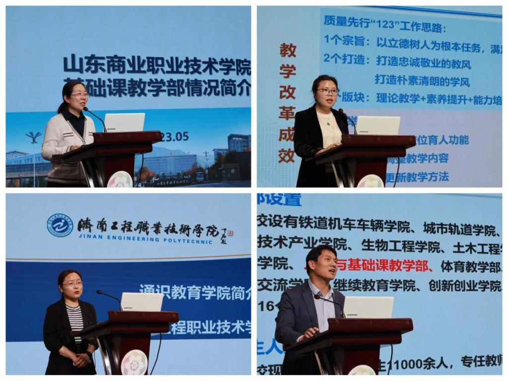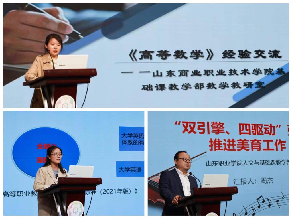 各參會院校基礎部(通識教育學院)領導分別介紹了各自機構設置、人員構成、學科特色,以及在基礎課程建設與改革方面取得的成績。山東商業職業技術學院數學教研室主任袁海君做了題為《高等數學經驗交流》的報告,詳細介紹了數學教學與專業融合的“兩個淡化三個強化五個融入”原則,并展示了在課程改革和教學研究方面取得的顯著成果;濟南工程職業技術學院英語教研室主任王磊做了題為《職場通用英語課程介紹》的報告,分享了落實教育部新課標的英語教學模式改革和在課程思政建設方面取得的成績;我校人文與基礎課教學部黨總支副書記周杰分別以《“雙引擎、四驅動”強勁推進美育工作》《新時代四四制勞動教育體系構建與實踐》為題分享了我校在美育、勞育方面的典型經驗做法。