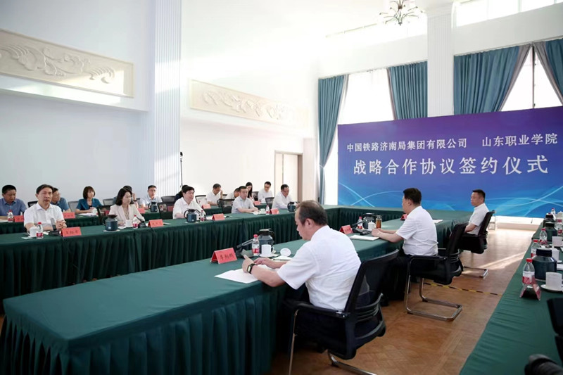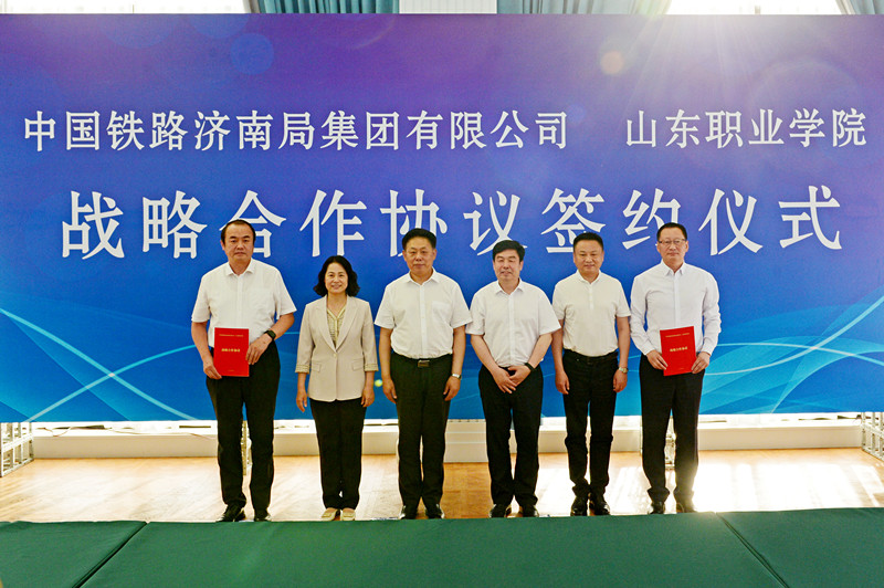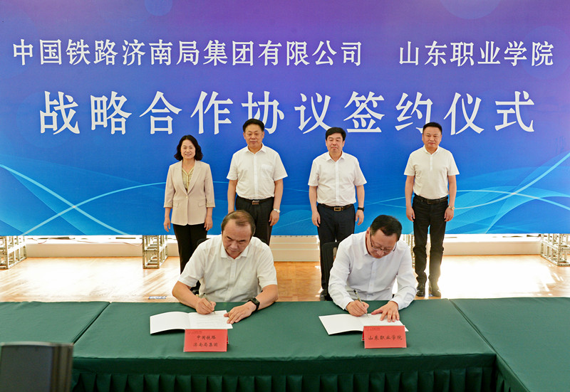 李翔鵬、郭培謙代表雙方簽署《中國鐵路濟南局集團有限公司 山東職業學院戰略合作協議》。根據協議,雙方將在人才培養、師資隊伍建設、科技創新等重點領域深入開展合作。