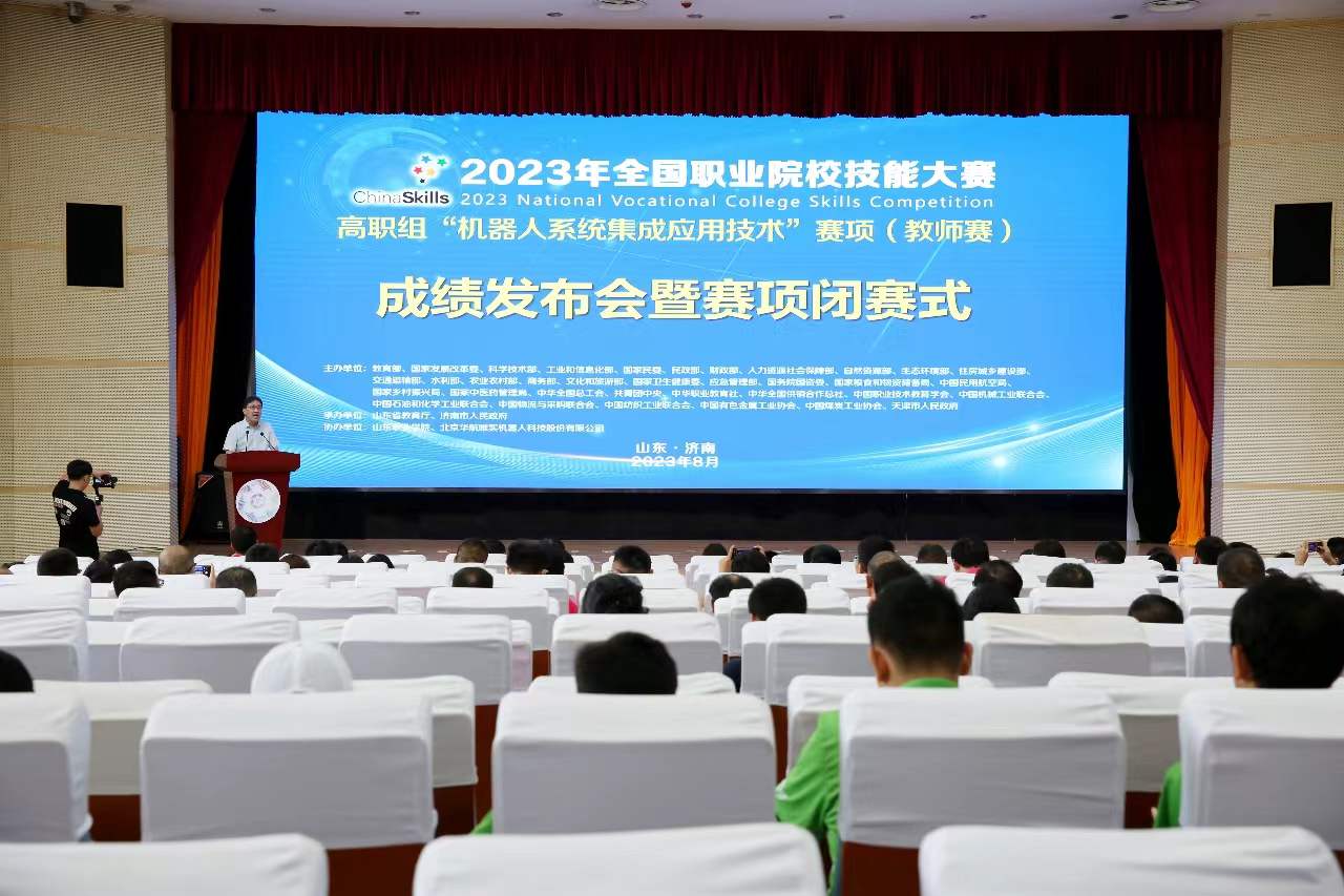 8月24日,2023年全國職業院校技能大賽高職組“機器人系統集成應用技術”賽項教師賽成績發布會暨賽項閉賽式在我校圖書行政樓西報告廳舉行。學校黨委書記、省教育廳發展規劃處處長、賽項執委會委員趙鳳文,黨委副書記、院長、賽項執委會委員郭培謙,賽項專家組長王曉勇、裁判長李翔、監督仲裁組長尹玉杰,北京華航唯實機器人科技股份有限公司副總經理柴華出席會議。教師賽各代表隊領隊、參賽教師等參加閉賽式。成績發布會暨閉賽式由副院長王紹軍主持。