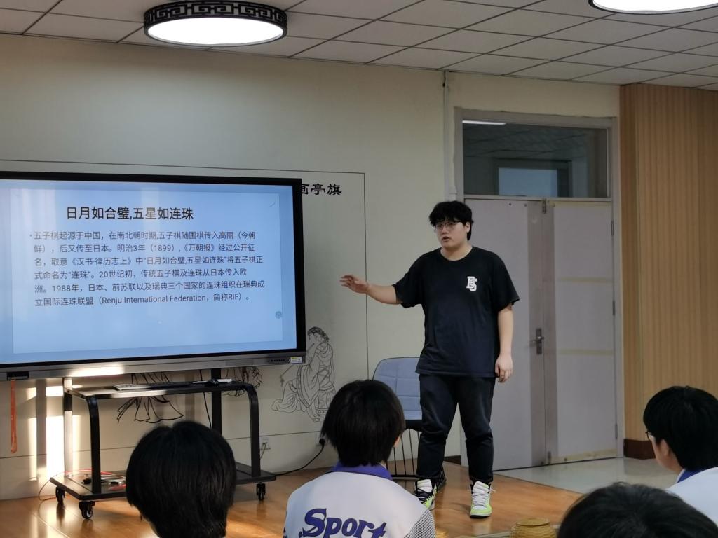 付叢睿首先介紹了五子棋的起源,并分別從棋盤、行棋規則等方面向同學們傳授了五子棋的基本知識。在技能講解階段,以圖文并茂的方式為同學們介紹了“三三”“四三”等五子棋取勝的基本形。大家邊聽邊練,課堂上棋子間碰撞的“嘩嘩”聲與同學們切磋時的探討聲交織,課堂氛圍有序且熱烈。