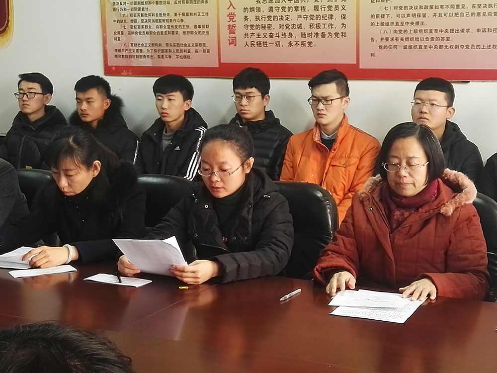 大會在嘹亮的《國歌》中開始。首先,15名發展對象分別向支部大會宣讀了自己的入黨志愿書,表明了加入黨組織的強烈愿望和堅定不移跟黨走為共產主義事業奮斗終身的決心。隨后,入黨介紹人對發展對象的表現情況向大會發表介紹意見。經支部黨員投票表決,一致同意接收15名發展對象為中共預備黨員。15名入黨發展對象在會上分別作了表態發言,表示對黨忠誠,積極工作,為共產主義奮斗終身,隨時準備為黨和人民犧牲一切,永不叛黨。最后,張霞書記在講話中希望新黨員要牢記入黨宗旨,在思想上、行動上全面入黨,積極工作,充分發揮黨員先鋒模范作用。會議在雄壯的《國際歌》中圓滿結束。
