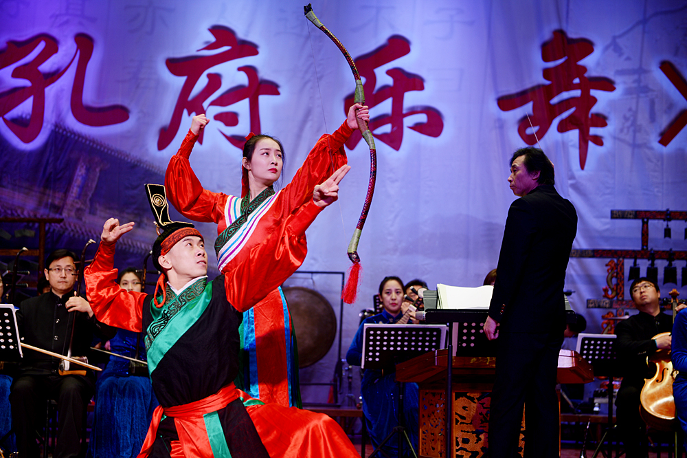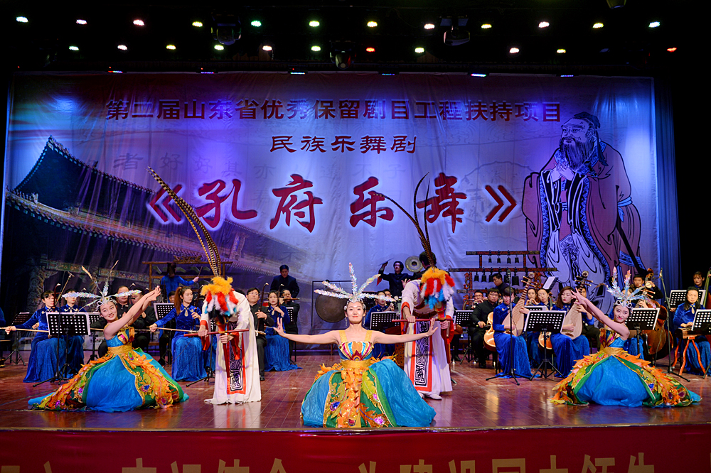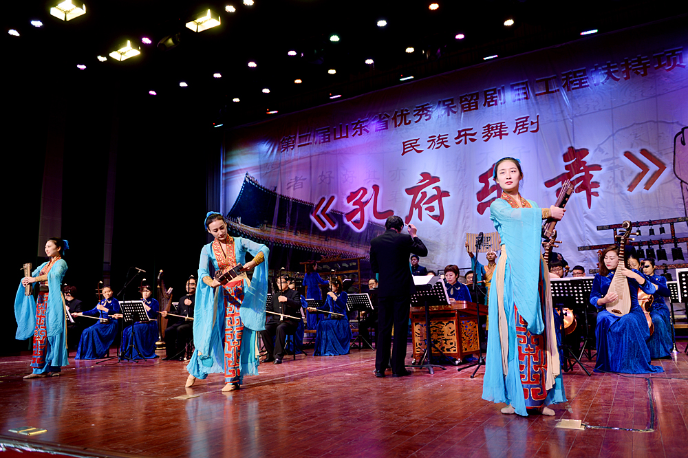 《孔府樂舞》是第二屆山東省優秀保留劇目工程扶持項目,由山東省歌舞劇院民族樂團創作。整部劇以頌揚孔子思想為主脈線,從《大哉孔子》的恢宏、莊嚴開始,劇中的鐘樂篇、禮樂篇、鼓樂篇的音樂創作取材《詩經》、杏壇講學、《幽蘭操》、闕里古韻等與孔子有關的典籍、事跡,在多角度展示孔子思想精髓的同時,展現儒家文化魅力,歌頌儒家文化對中國歷史的巨大影響和重要地位。