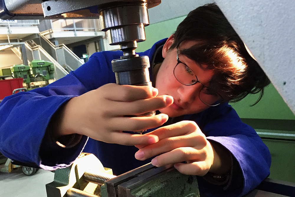 共同克服溝通關,攜手完成新項目——《微型手動鉆床制作》是此次師生訪問交流期間的一項重要合作項目。盡管學院師生具有一定英語基礎,但由于德方師生日常使用德語,且雙方文化背景、思維習慣、表達方式等方面有不小差異,學習中使用的機器設備不同,所以在項目開始階段,需要共同克服溝通障礙。