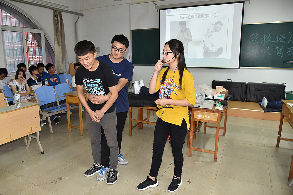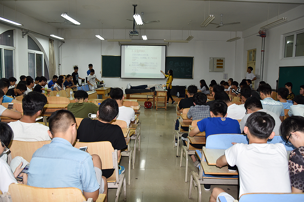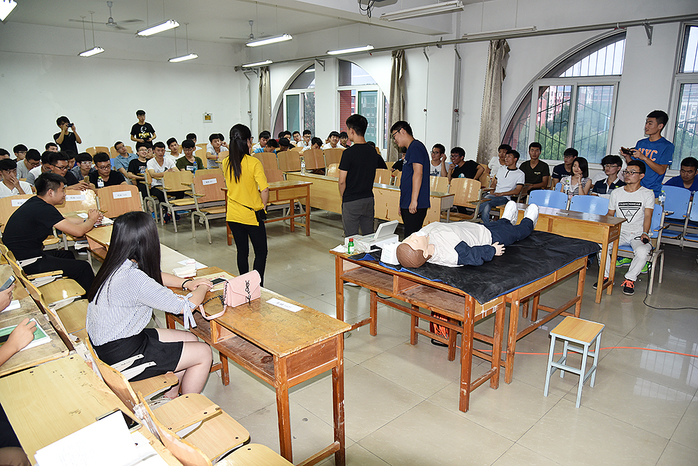 培訓中,主講同學通過多媒體的形式,為學生展示了急救知識,包括骨折的固定與搬運、止血的基本常識、心肺復蘇、人工呼吸等。主講同學重點講述了如何判斷救助者屬于需要心肺復蘇患者,分為意識、呼吸、心跳三種判斷方法。然后講述了心肺復蘇分為兩種:1、胸外心臟按壓2、人工呼吸。并具體講述了救助過程中需要注意的問題和經常出現的錯誤,以免對患者造成二次傷害。隨后在有獎體驗環節中,同學們表現的更為踴躍,盡管學生都聽的很認真,但在實踐過程中還是有或多或少的錯誤發生,此時主講人員在一旁耐心的為同學們糾正著錯誤,直到同學們對這項救助技能真正掌握為止。