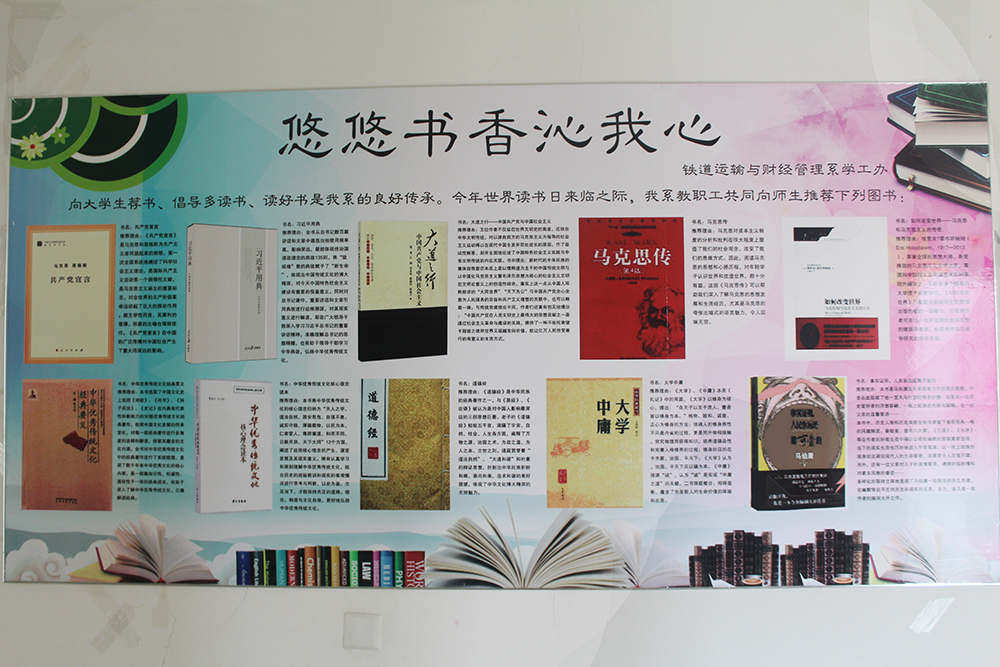 近日,鐵道運輸與財經管理系“書香沁我心”讀書月活動圓滿落下帷幕。讀書月活動從四月下旬開始,歷時三十多天。讀書月中各班級紛紛舉辦了“悠悠書香沁我心”主題班會,教職工向同學推薦二十本“讀書書目”,舉辦了“悠悠書香沁我心”讀書心得征文比賽、“我最推崇的主人公” 讀書心得演講比賽、“勞動最光榮”詩文朗誦比賽,開辦了“書香沁我心”書法興趣班以及同學間相互推薦、借閱的“好書共享” 圖書“漂流”活動。讀書月活動的開展,激發了同學們的閱讀興趣,促進了良好讀書習慣的養成,營造出“書香校園”的氛圍。