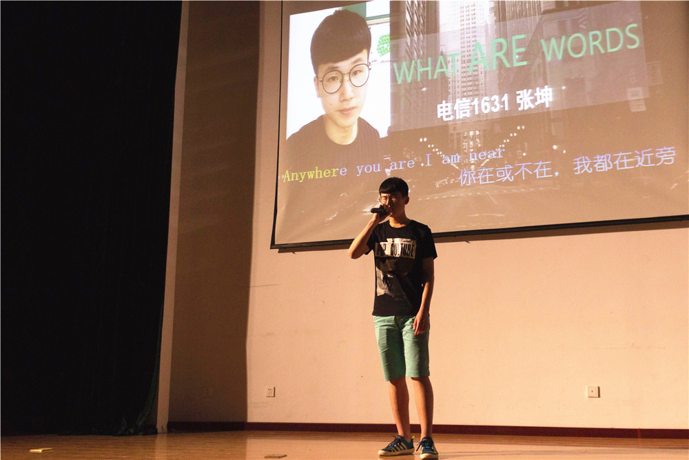 在現場熱烈的掌聲中,在親友團的熱情呼喚中比賽正式開始。一首首悅耳動人的歌曲,一次次深情嫻熟的英文演繹,仿佛帶來大家穿越了時空去領略那美輪美奐的異域風情:其中來自鐵道機車與機電裝備系的4號選手李向成和7號選手吳靜杰選手表現出眾,他們一個是激情歡快的說唱饒舌,一個是深情脈脈的舒緩演繹,給在場的評委老師和觀眾們留下了深刻的印象。此外,8號張澤悅選手的渾厚低音與寬廣的音域也讓大家耳目一新。