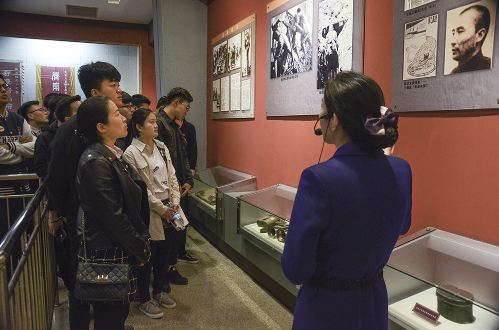 在革命烈士紀念群雕前,全體同學鞠躬、默哀,以此寄托對革命烈士們的深深敬意和無限哀思。電信1632班曲志卓向大家發出倡議,號召大家永遠銘記革命先烈英雄事跡,繼承英勇不屈、頑強奮斗的英雄精神,自覺肩負起歷史責任與使命。隨后同學們參觀了濟南戰役紀念館。犧牲烈士留下來的立功獎狀、功勞證、軍功章、染有血跡的黨費等珍貴文物,見證著烈士們艱苦卓絕的戰斗歷程,也把同學們帶回到了當年跌宕起伏、波瀾壯闊的革命戰爭歲月。