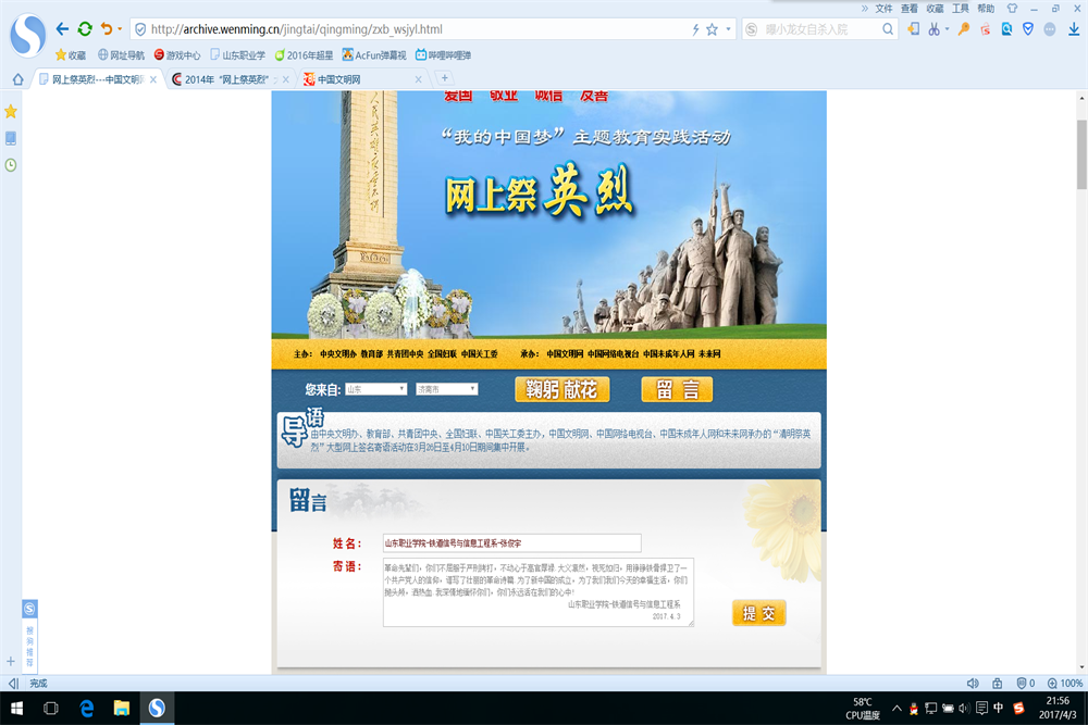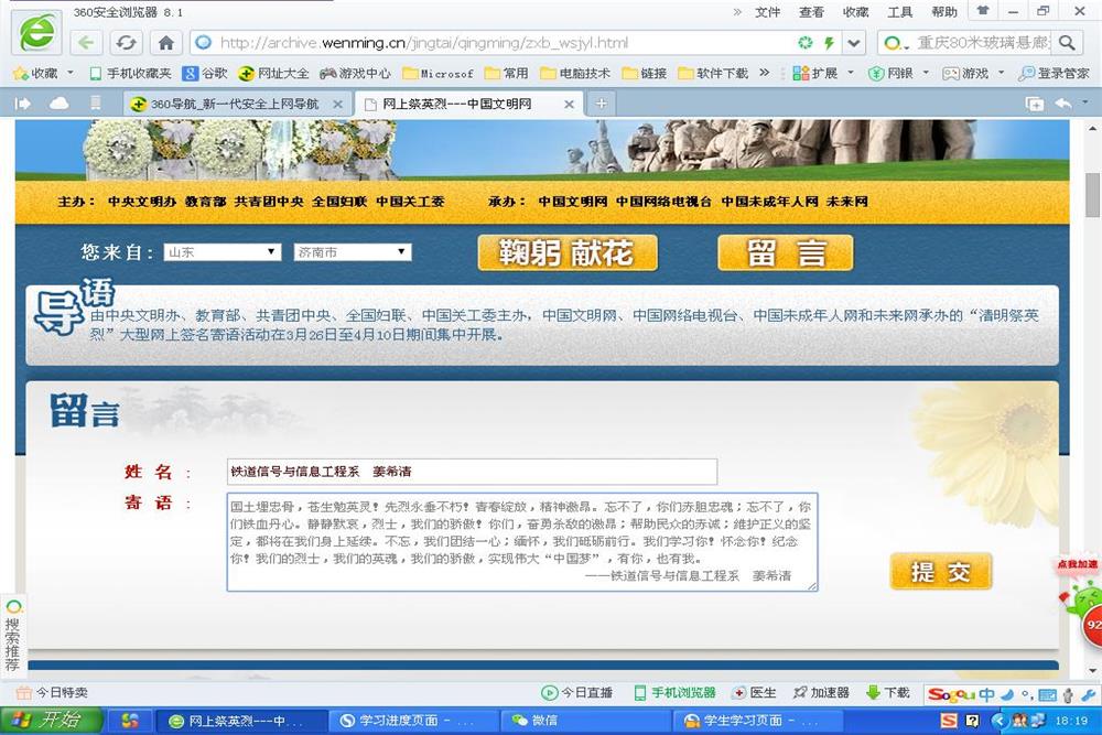 清明期間,鐵道信號與信息工程系組織開展了“清明祭英烈 傳承愛國情”活動。利用新媒體祭奠是此次活動的重要內容之一,同學們依托中國文明網向英烈鞠躬獻花、簽名寄語。此次活動讓同學們進一步了解了民族解放歷史,學習弘揚了優秀革命傳統,踐行了低碳環保理念。