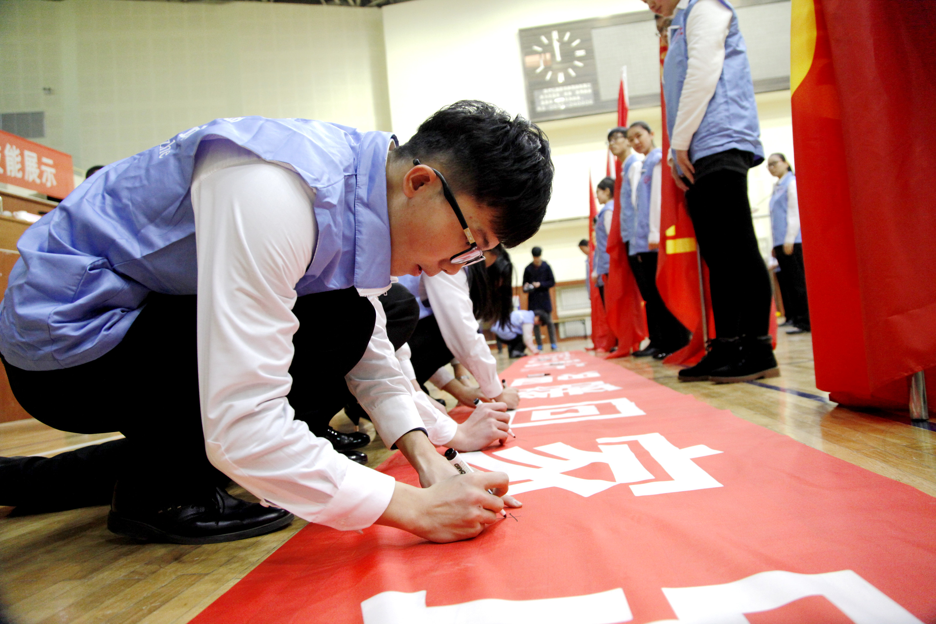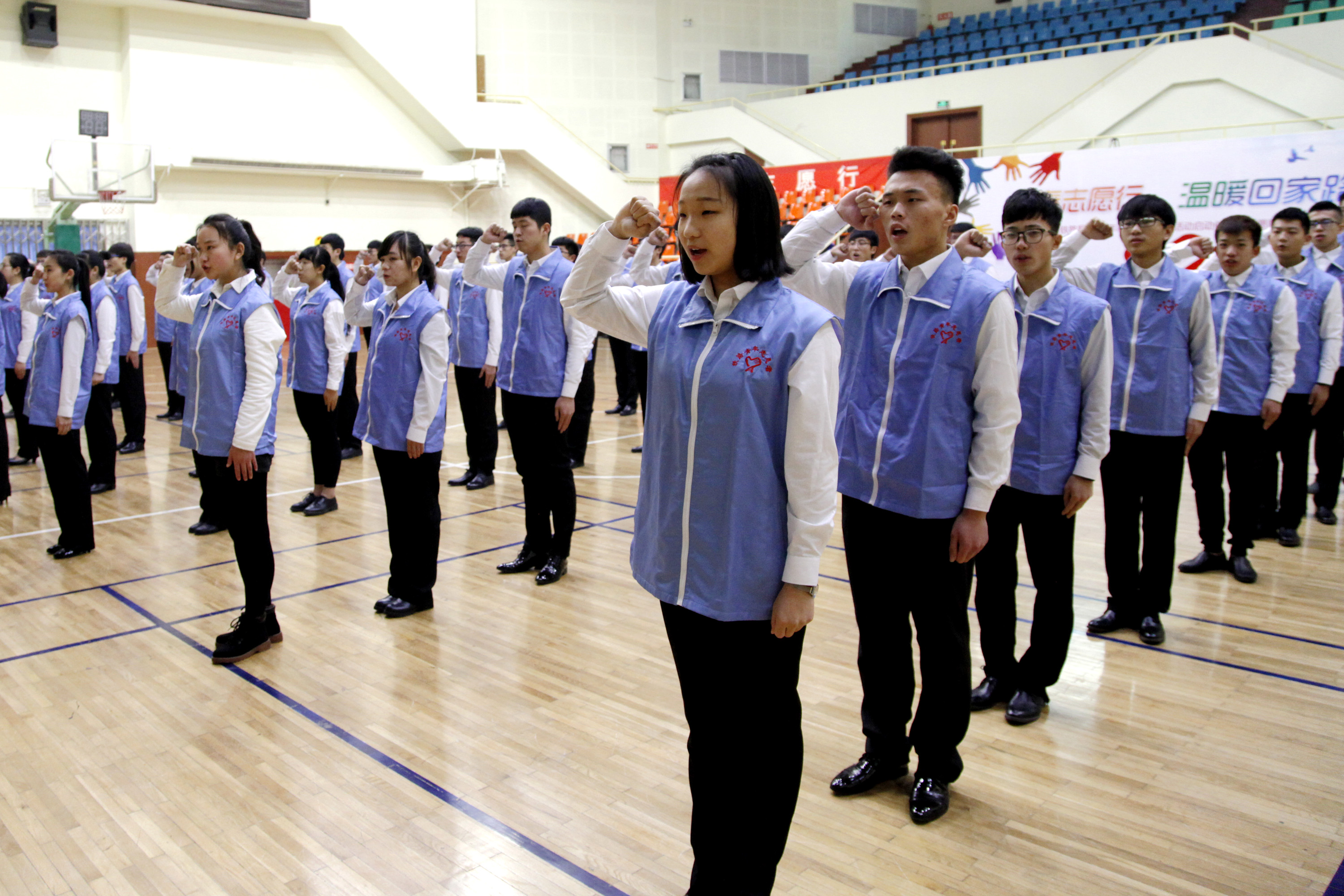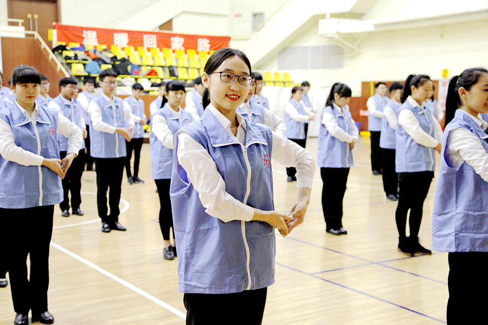 1月13日上午,濟南鐵路局2017年春運志愿服務活動啟動儀式暨志愿服務技能展示在鐵路體育館舉行。山東省志愿者行動指導中心主任劉北雪、濟南鐵路局團委副書記胡海、濟南鐵路局客運處副處長宗輝、山東職業學院團委書記王偉、山東職業學院鐵道供電與電氣工程系黨總支書記劉紅出席活動。山東職業學院“紅藍青”志愿者協會的同學們以手語操表演《感恩的心》和英語服務情景對話展示將專業、溫情的志愿服務表現得淋漓盡致。參與志愿服務的同學們在第十一屆中國優秀青年志愿者濟南鐵路局王孜慧同志的倡議下簽名并鄭重宣誓:盡己所能,不計報酬,幫助他人,服務社會,踐行志愿精神,傳播先進文化,為建設團結互助、平等友愛、共同進步的美好社會貢獻力量。