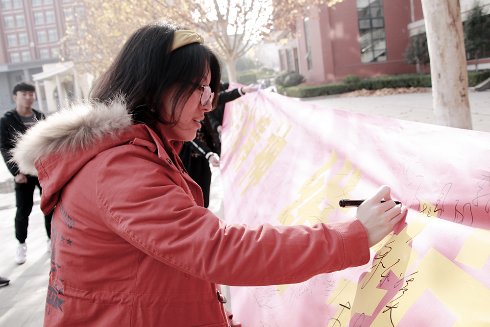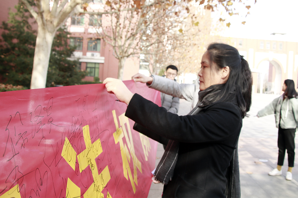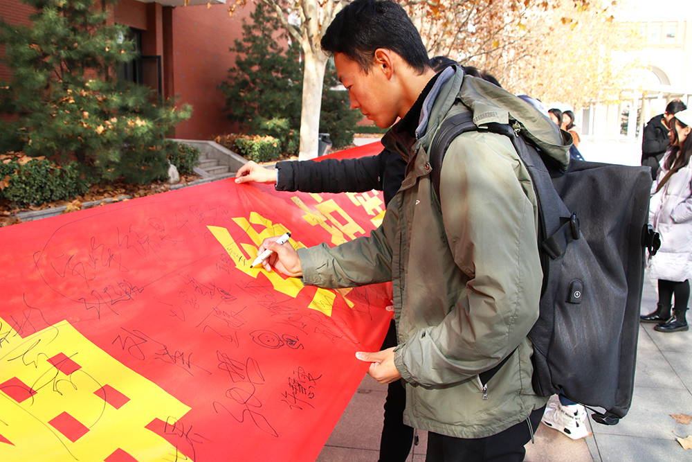 在簽名活動中,青年志愿者協會工作人員手舉憲法日宣傳橫幅,為同學們講解憲法知識,傳遞法律信息。同學們認真聆聽工作人員的講解,在橫幅上簽下自己的姓名,并鞠躬敬禮,以表示自己對憲法的尊重。
