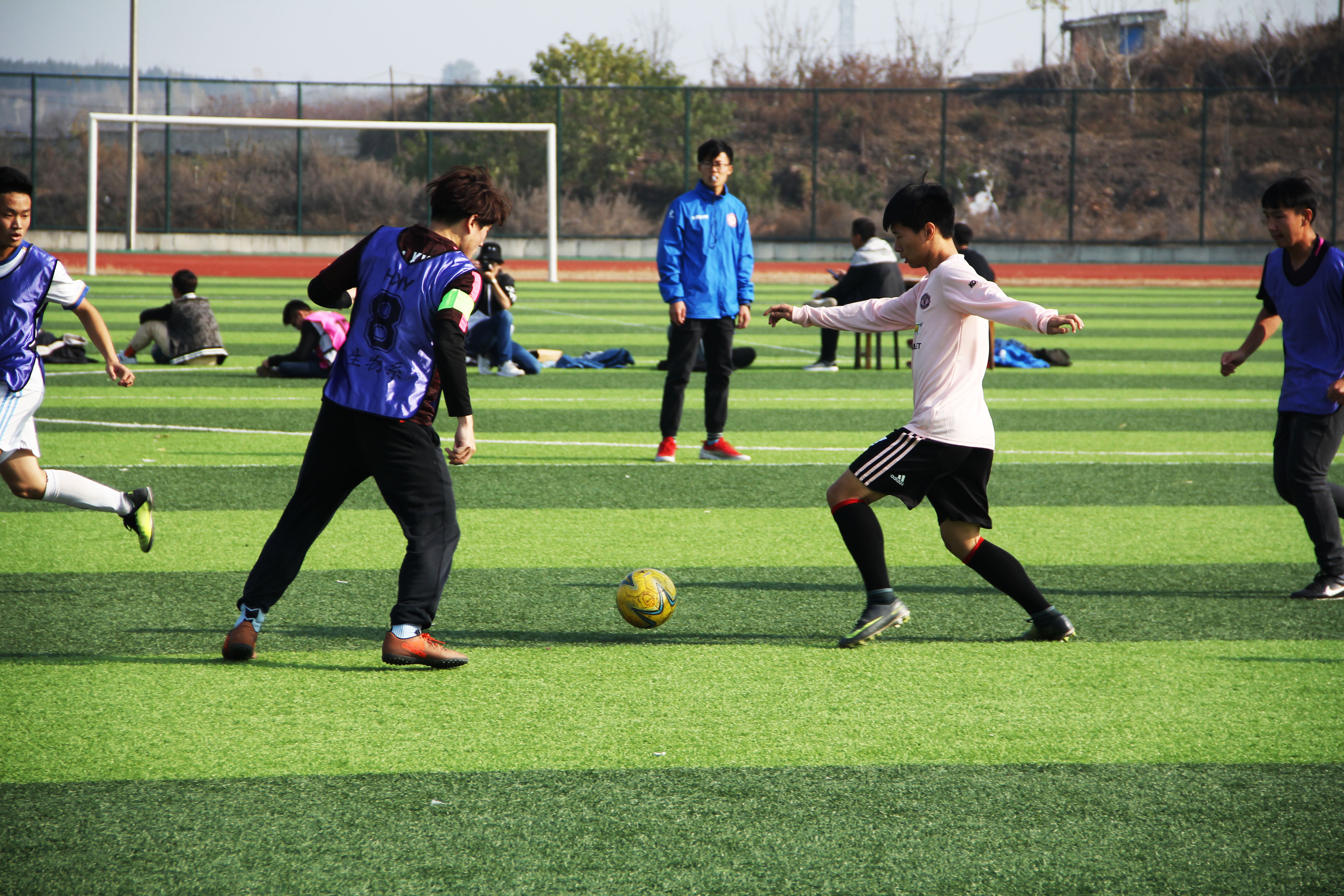 “傳球,傳球”“進了!”一個個專業不失水準的踢球動作,一聲聲飄逸而跌宕起伏的吶喊,一層層完全被賽場廝殺所感染并揪著心的觀眾。如此精彩的一幕在學校足球場上呈現出來,這正是鐵道車輛與機械工程系隊與生物工程系隊展開的一場精彩紛呈的球技對決。