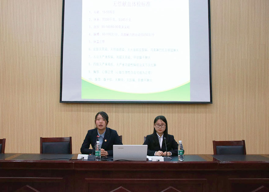 主講人王紅玉首先從什么是無償獻血,到為什么實行無償獻血,一步步引導大家認識獻血的重要性。隨后,她運用數據、表格的方式對比分析了各國家、地區獻血的比例,并表示國家頒布《中華人民共和國獻血法》鼓勵在校學生率先獻血,學院也希望大家奉獻愛心,把自己的大愛之情,用到那些翹首期盼的病人身上。接下來,她又強調了獻血的益處,她說:“獻血可以預防心腦血管疾病,刺激骨髓造血功能,預防癌癥的發生。”最后,她又向大家介紹了獻血體檢得標準,具體的獻血流程及獻血后的注意事項等。