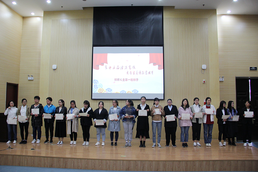 本次比賽以“扣好人生第一粒扣子”為演講主題,選手們以清晰的發音、自然的表達、優美的語言、嫻熟的口語能力和自信的微笑,展現出對英語學習的熱愛和執著,同時也展現出了昔日的努力和對人生的憧憬。比賽期間,選手們還進行了才藝表演,美妙動聽的英文歌、激情洋溢的熱舞、深情飽滿的朗誦、鏗鏘有力的雙截棍表演等,給觀眾帶來了一場聽覺和視覺的饕餮盛宴。經過激烈角逐,最終來自山東財經大學的安淼淼獲得特等獎,我院獲3個一等獎。