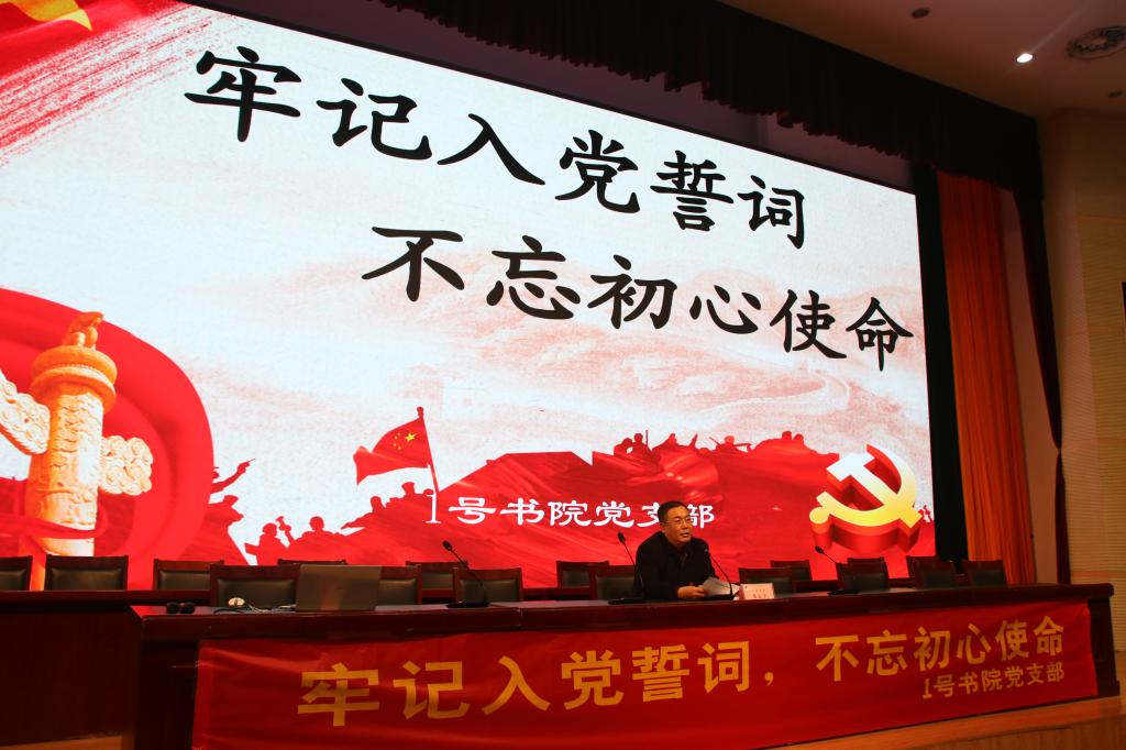 12月25日,書院黨支部書記呂立寧講授“牢記入黨誓詞 不忘初心使命”黨課。呂立寧首先帶領大家在莊嚴的國歌下重溫了入黨誓詞,隨后引用了習近平總書記的一句話告誡大家:“入黨誓詞字數不多,記住并不難,難的是終身堅守。每個黨員要牢記入黨誓詞,經常加以對照,堅定不移,終生不渝。”全體黨員要自覺用習近平新時代中國特色社會主義思想武裝頭腦,堅定為共產主義事業奮斗終身的信心和決心,牢記共產黨員的政治責任和初心使命,永葆共產黨員的政治本色。