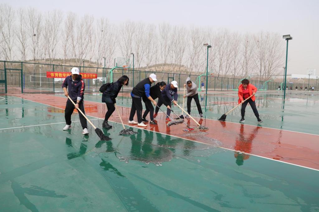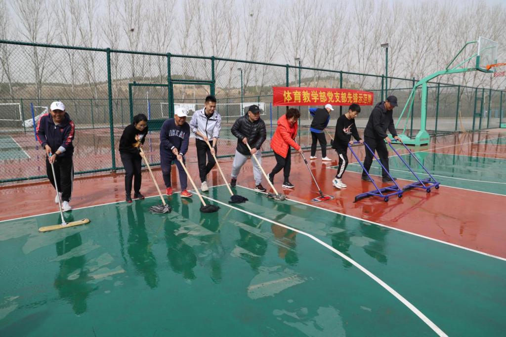 黨旗飄飄,黨徽閃閃。3月17日下午,體育教學部黨支部舉行黨日活動,在學院東籃球場、排球場、網球場清掃樹葉,拖、擦塑膠場地。