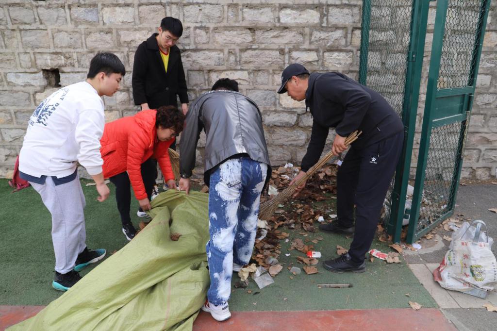 周廣東老師和學生相互配合、分工合作,將籃球場上的煙頭、樹葉清掃運走。