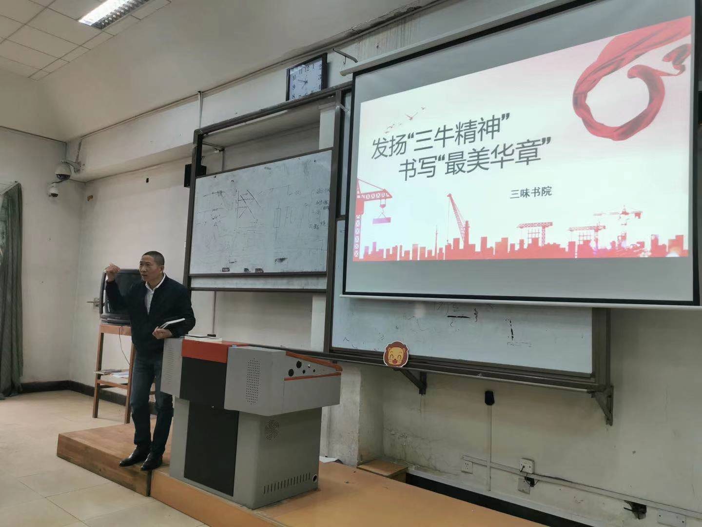 為提高同學們的服務意識,增強創新精神。3月20日,三味書院舉辦“發揚‘三牛精神’,書寫‘最美華章’”專題講座。講座由書院副院長楊廷富主持,2018級部分學生參加。