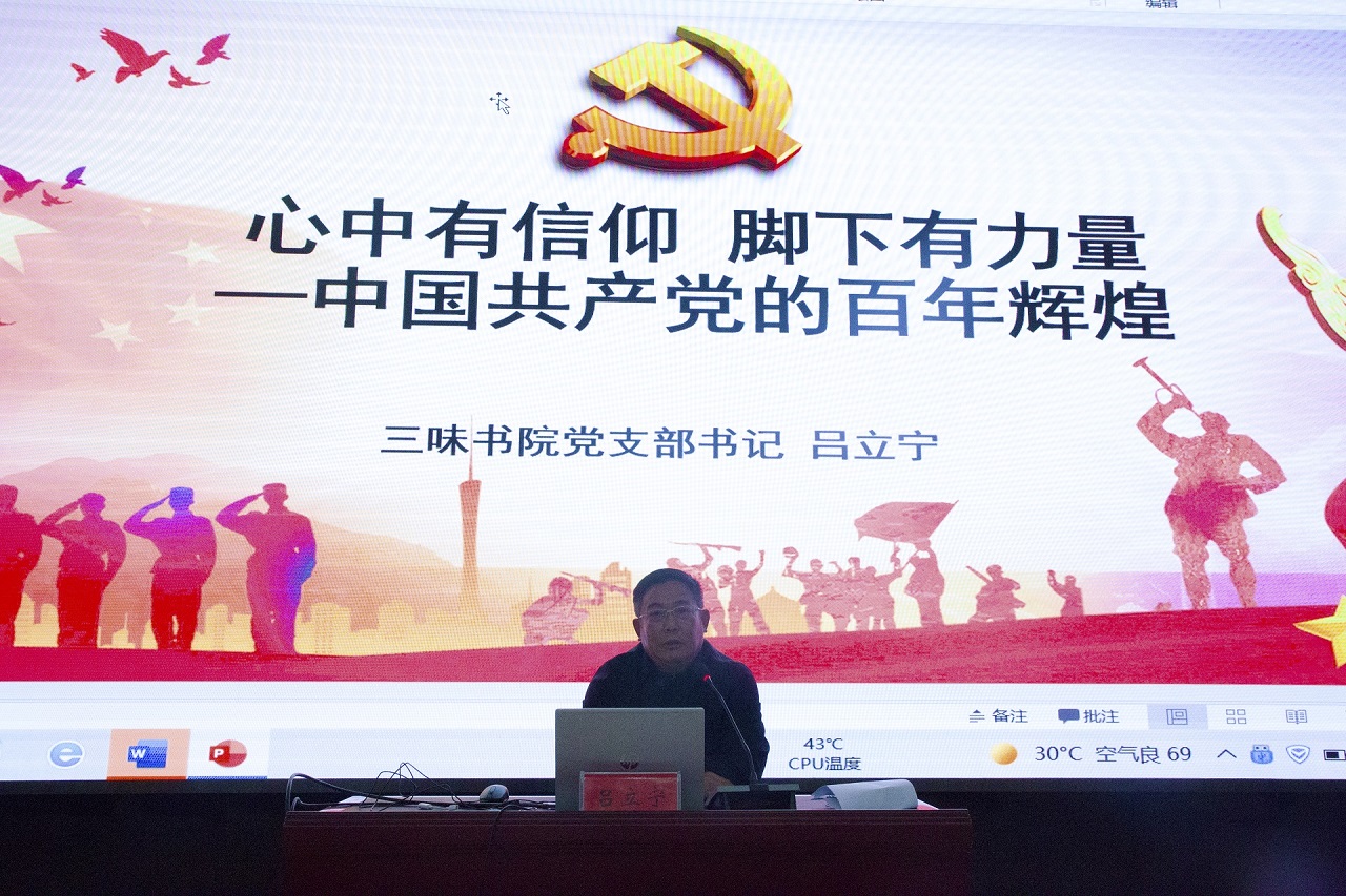 為促進書院黨史學習教育走深走實,不斷提高學生的思想水平和政治覺悟,10月19日,三味書院黨支部書記呂立寧在圖書行政樓西報告廳講授“心中有信仰 腳下有力量—中國共產黨的百年輝煌”主題黨課,三味書院2021級各書社學生干部、學生會團總支干部400余人參加。