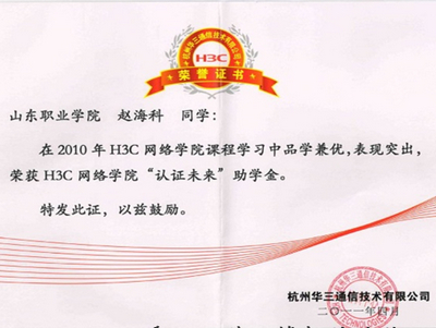 3.“H3C網絡學院”獎學金和貧困生助學金。杭州華三通信技術有限公司每年提供1500元的H3C網絡學院“網絡人才獎學金和1000元的“貧困生助學金”獎勵在H3C特色班學習中成績優異、品學兼優、表現突出的學生。