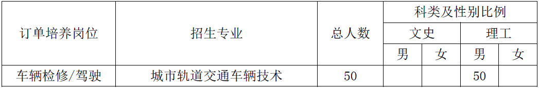 訂單生包含兩個培養方向,即車輛檢修方向和電客車駕駛方向;車輛檢修方向男身高165cm及以上;電客車駕駛方向要求男身高不低于168cm,雙眼裸視視力達0.8(4.9);訂單生均要求無色盲、色弱、高度近視、心臟病、傳染病及精神和心理障礙,無口吃,無紋身,普通話良好。