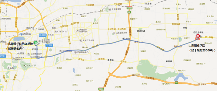 從山東職業學院培訓基地(解放路62號,面試地點)出發,沿解放路東行150米右轉,由山大路南向行駛至經十路,左轉向東直線行駛27公里,經十東路路南即到(學院有大型戶外指示,距離1-2公里能看到)。