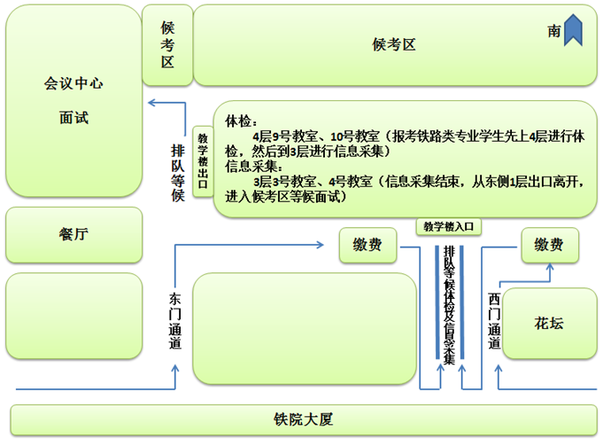 鐵路類專業考生先去4層進行體檢,通過體檢考生持體檢表到3層進行信息采集,未通過體檢考生進行登記;非鐵路類考生直接去3層進行信息采集。