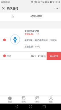 (四)登錄進考生本人收費頁面后,選擇繳費選項,點擊確認支付。