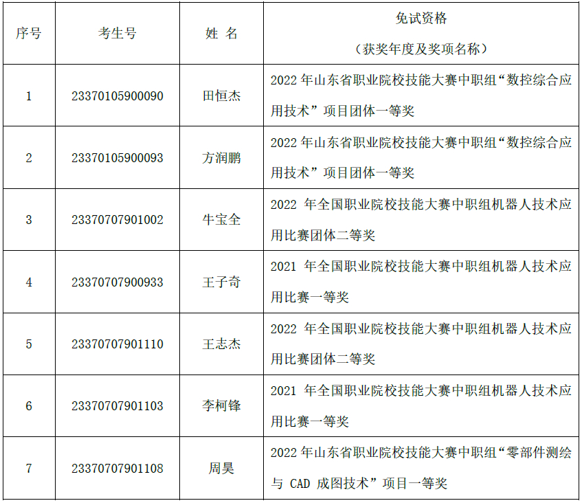 根據山東省教育廳《關于做好2023年高職(專科)單獨考試招生和綜合評價招生工作的通知》(魯教學函〔2022〕28號)《山東職業學院2023年高職(專科)單獨考試招生和綜合評價招生章程》要求,按照考生申報、學校初審、教育主管部門最終審核流程,我校初審通過單獨考試招生免試考生7人,現予以公示。公示結束后將免試考生相關材料報送上級教育主管部門,最終符合免試資格考生名單以上級教育主管部門審核為準。